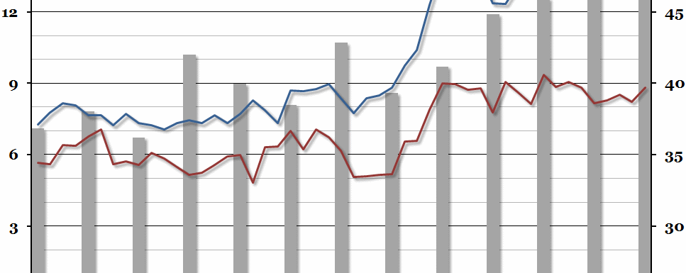 The red and blue lines show the unemployment rate (the percentage of people within a group that are looking for work but cannot find any) for recent graduates and young non-graduates respectively, measured against the left hand axis. Recent graduates are defined as anyone over 20 who has left full-time education within the past 5 years and who has a level of higher education above A Level standard. Young non-graduates are people aged between 21 and 30 who have not completed a level of education above A Level standard. The grey bars, measured against the right hand side, shows the percentage of recent graduates who are working in “non-graduate jobs”, defined as one which does not require a higher educational background.