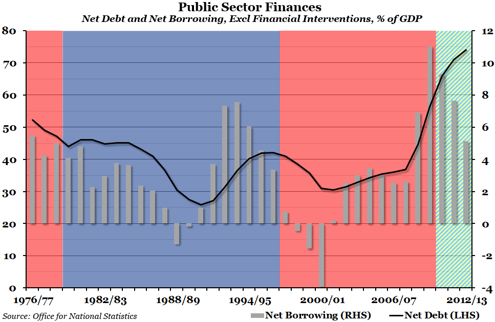 The black line, measured against the left hand side, shows the total public sector net debt, excluding the effect of financial interventions, as a percentage of GDP. The gray bars, measured against the right hand side, show public sector net borrowing, also excluding financial interventions and as a percentage of GDP. A positive figure for net borrowing is the budget deficit; a negative figure for net borrowing means there was a budget surplus that year. The background shading shows which political party was in power at the time – red for Labour, blue for Conservatives, and the rather attractive blue/yellow striped pattern to signify the Conservative – Liberal Democrat coalition.