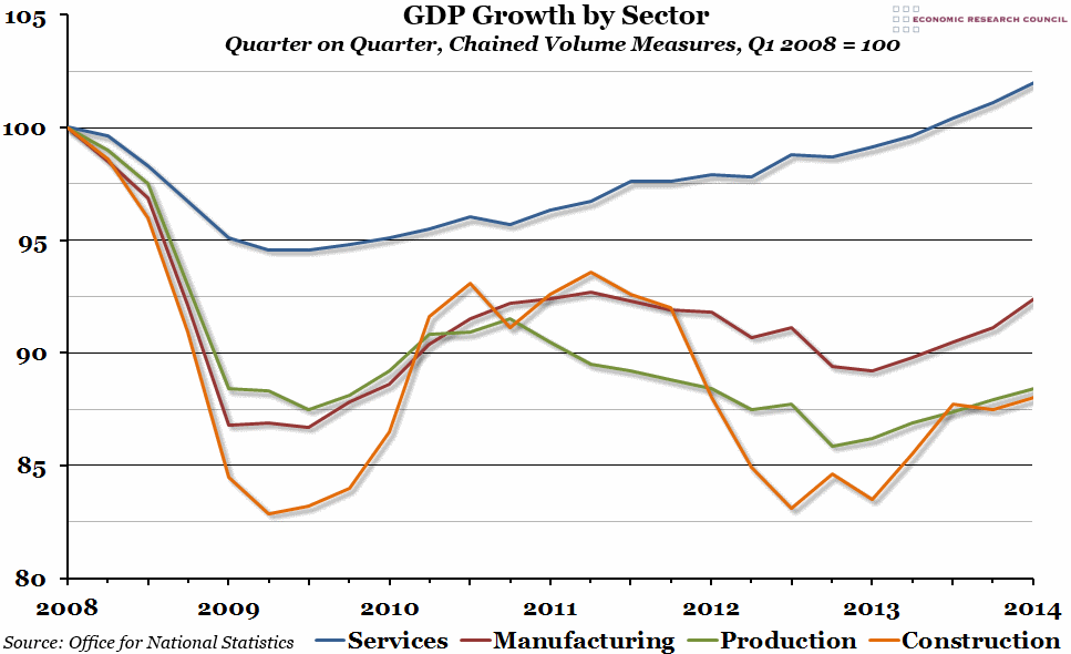 The chart shows how output of the three main sectors making up the economy has changed since the peak of GDP at the beginning of 2008, indexed so that a value of 100 represents the output at that peak. The blue line shows the services sector (which is the biggest sector in the UK in employment terms), the green line the production sector (a subset of which is manufacturing, represented here by the blue line due to significant differences from the rest of the production sector), and the orange line the construction sector.