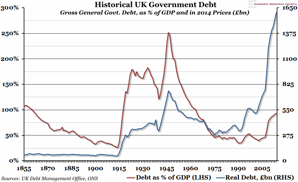 The chart shows the level of gross debt held by general government (central government plus local governments) in the UK. The red line, measured against the left hand axis, shows debt as a percentage of Gross Domestic Product. The blue line, measured against the right hand axis, shows real debt levels in 2014 prices (that is, allowing for inflation using historical CPI) in billions of pounds. Please note that general government gross debt is not the preferred method of measuring public debt – that is Public Sector Net Debt – but it is the best historical data we have available.