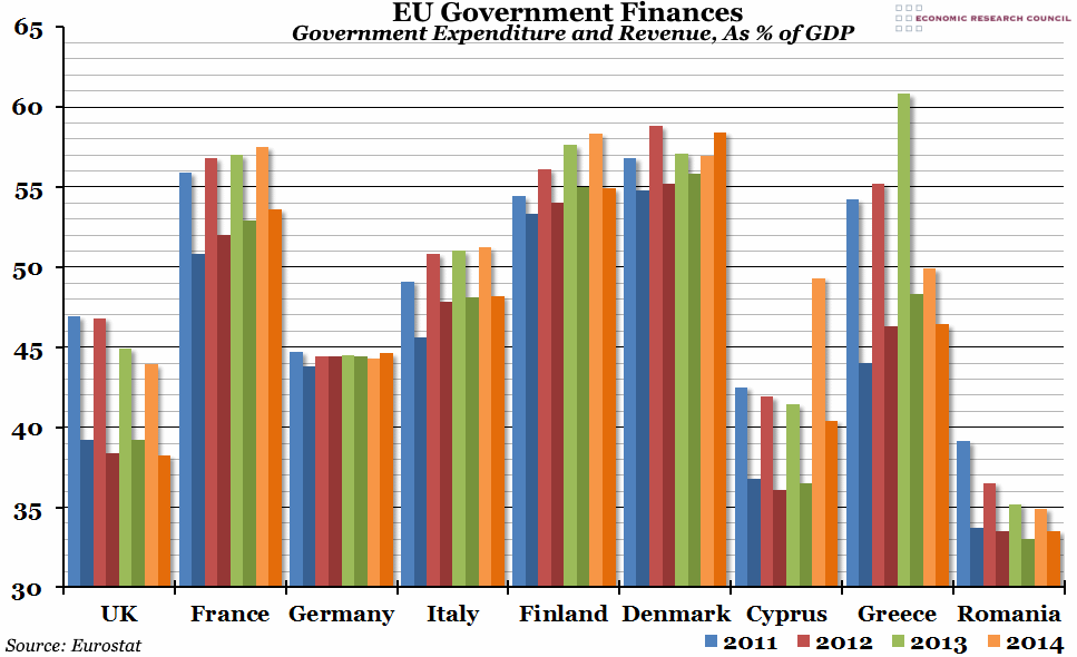 The other countries included in the chart are all examples of the extremes of European government finances. Finland has the highest level of government spending (although as you can see, France and Denmark are not far behind), driven mainly by the poor state of their economy in recent years. Denmark has both the highest level of government revenue, and also the biggest surplus (+1.5% of GDP) – two facts which are clearly related. Cyprus has the worst deficit (-8.9% of GDP), after government spending exploded in 2014. Romania has the smallest government in the EU, with both lowest expenditure and lowest revenue, and the contrast to countries like Denmark and Finland is stark. And finally, Greece has been included to show the alarming state of their government finances in 2011-2013, and to point out that despite popular belief, their tax revenues were higher as a percentage of their GDP than Germany’s were in every year since 2011.