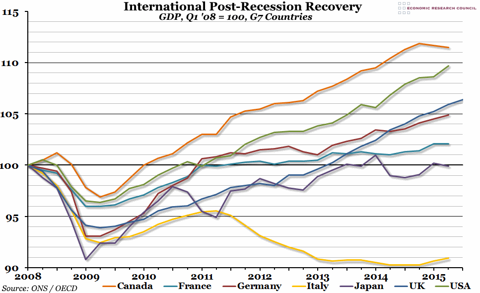 The chart shows an index of Gross Domestic Product (GDP) for each of the G7 economies. The index is calculated using chained volume estimates (designed to counter inflation) in the relevant local currency, and adjusted so that its value at the pre-recessionary peak (which differs across countries, but for our purposes is taken to mean the first quarter of 2008) is equal to 100. This means that any value above 100 represents a higher real level of national output than before the recession hit, and vice versa.