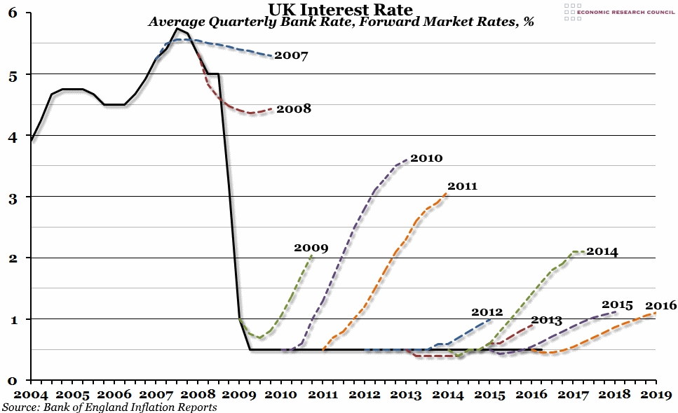 The black line on the chart shows the official Bank Rate (the base interest rate set by the Bank of England), averaged out over each quarter, since the beginning of 2004. Each dashed line shows the forecast for future interest rates shown in each of the last ten February Inflation Reports. These estimates are based on the overnight swap rates in the three weeks leading up to the Report.