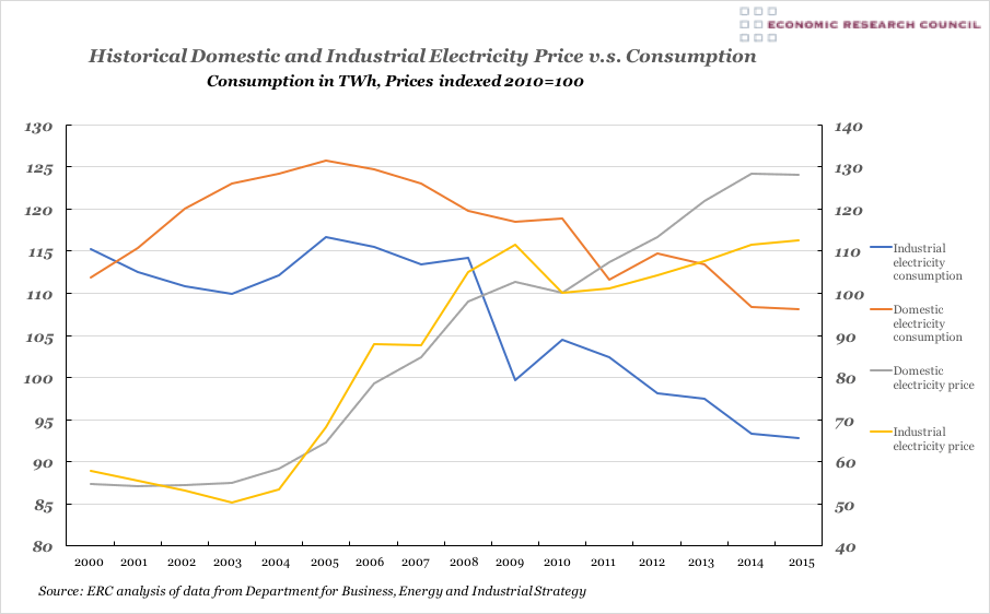 The chart displays the industrial (blue) and domestic (orange) electricity consumption in trillion Watt hours, measured against the left-hand axis. The data is annual from 2000 until 2015. Against the right-hand axis, the trend in the cost of electricity is displayed for domestic (grey) and industrial (yellow) use. The price data is indexed from 2010.