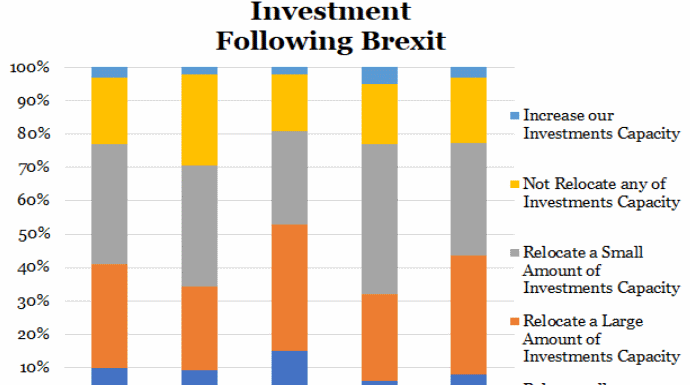 UBS reports that more than one tenth of their surveyed pool of corporations had stated an intention to leave the UK entirely following Britain’s exit from the EU. The results of the survey showed two main trends: the larger the firm, the greater the proportion of their business they planned to relocate post-Brexit; and that the stated desire to relocate was more pronounced among those that deal in industrials and materials compared to consumer firms.