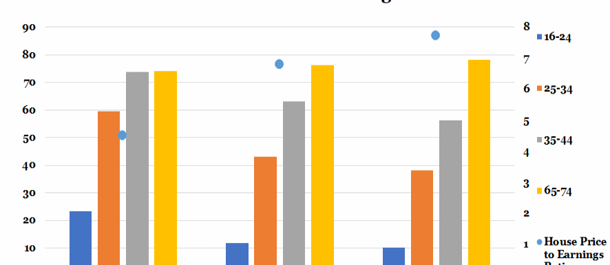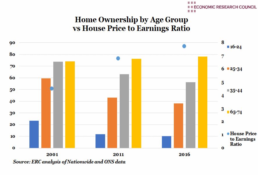 Levels of home-ownership among 25-34 and 35-44 year-olds has undergone a similar deterioration of 36% and 24% respectively. Only the proportion of home-owners among those aged 65-74 has increased slightly, from 74.2% in 2001 to 78.2% in 2016. The house price to earnings ratio in England has also increased dramatically (from 4.5 to 7.72), a result of the combination of soaring house prices and stagnating wages since the financial crash.