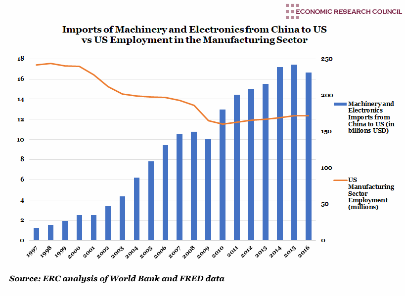 Over the past 20 years, the Chinese imports to the US have increased in value every year, bar two (in 2009, a result of the recession, and in 2016). The value of imports from China has increased by approximately 11.6% on average each year, but the proportion of this that machinery and electronics constitute has risen more quickly, by an average of 41%. In 1997, the US imported $65.8 billion worth of goods from China, with machinery and electronics making up 26% of this total. This total has increased significantly to $481.4 billion in 2016, machinery and electronics constituting almost a half of this. In the background, US employment in the manufacturing sector has contracted over the same period, by 5 million from 17.4 million to 12.4 million. Manufacturing employment took a large hit during the recession, and has plateaued in the 7 years since 2009. Although Trump has been very robust in linking the increase in Chinese imports to the deterioration of US manufacturing sector employment, the correlation is not definitive.