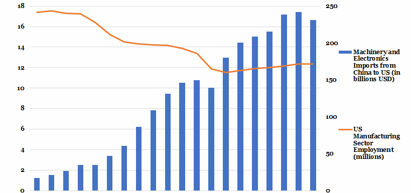 The chart shows the change in value of US machinery and electronics imports from China versus employment levels in the US manufacturing sector over the past 20 years. The blue bars display the amount of US imports of machinery and electronics in billions USD at current value measured against the right hand axis. The orange line shows the annual employment rate in millions in the US manufacturing sector and is measured against the left hand axis.