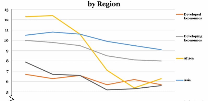 Global FDI rate of return (RoR)has dropped from an average of 8.1% in 2012 to 6.7% in 2017, the largest drop occurring between 2014 and 2015 when RoR dropped from 7.9% to 6.8%. Although diminishing returns have characterised this time period across all regions, the story is by far the worst in African economies, where between 2013 and 2016, rate of return on FDI dropped by 56%. Predictably, FDI in developed economies have returns that are among the lowest, but most stable, ranging from 6.7% in 2012 to 5.7% in 2017. Returns from FDI in developing economies dropped by a fifth in the period shown. Latin America and the Caribbean economies have had the second worst performance of the groups shown, dropping from a peak of 7.9% in 2012 to 5.2% within just 3 years.