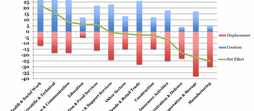 The industries that can expect significant net job losses are those with routine and repetitive tasks, as seen in the projection for the manufacturing as well as the transportation and storage sectors. Regarding the latter, the potential of driverless cars and automated warehouses is evident today and indeed already cutting the number of humans required in the industry. Similarly, in manufacturing, the use of algorithms and robotics is already making many routine factory tasks redundant. Fields such as cyber security and drone design can create jobs in the public administration and defence sector, but is offset in employment terms by the the automation of clerical roles.