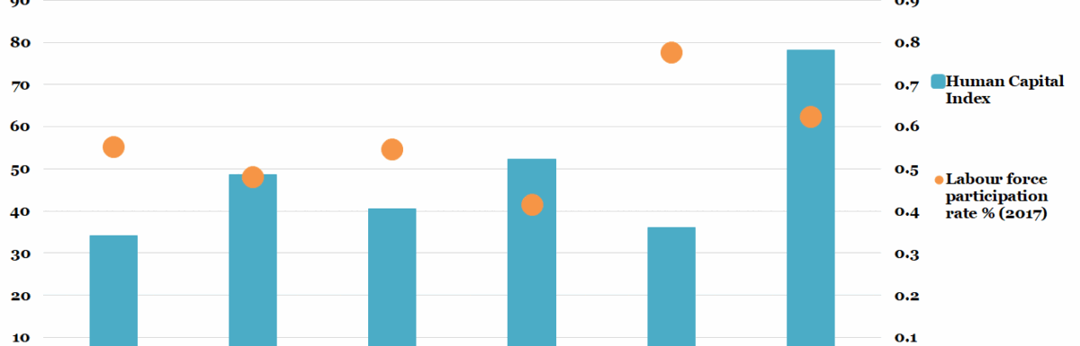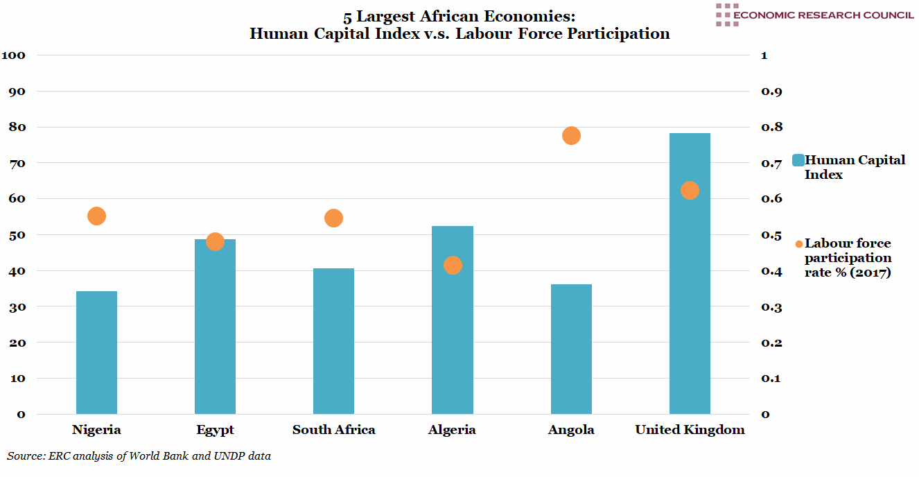The chart displays the human capital index (HCI) of the five largest economies in Africa, alongside the UK for reference. This is shown by the blue bars and measured against the right-hand axis. Each country’s total labour force participation (those aged 15 and over) is displayed as a percentage by the orange circular marker and measured against the left-hand axis. The data originates from the UNDP and refers to 2017. The five African nations are listed by GDP from highest to lowest, with the UK last for context.