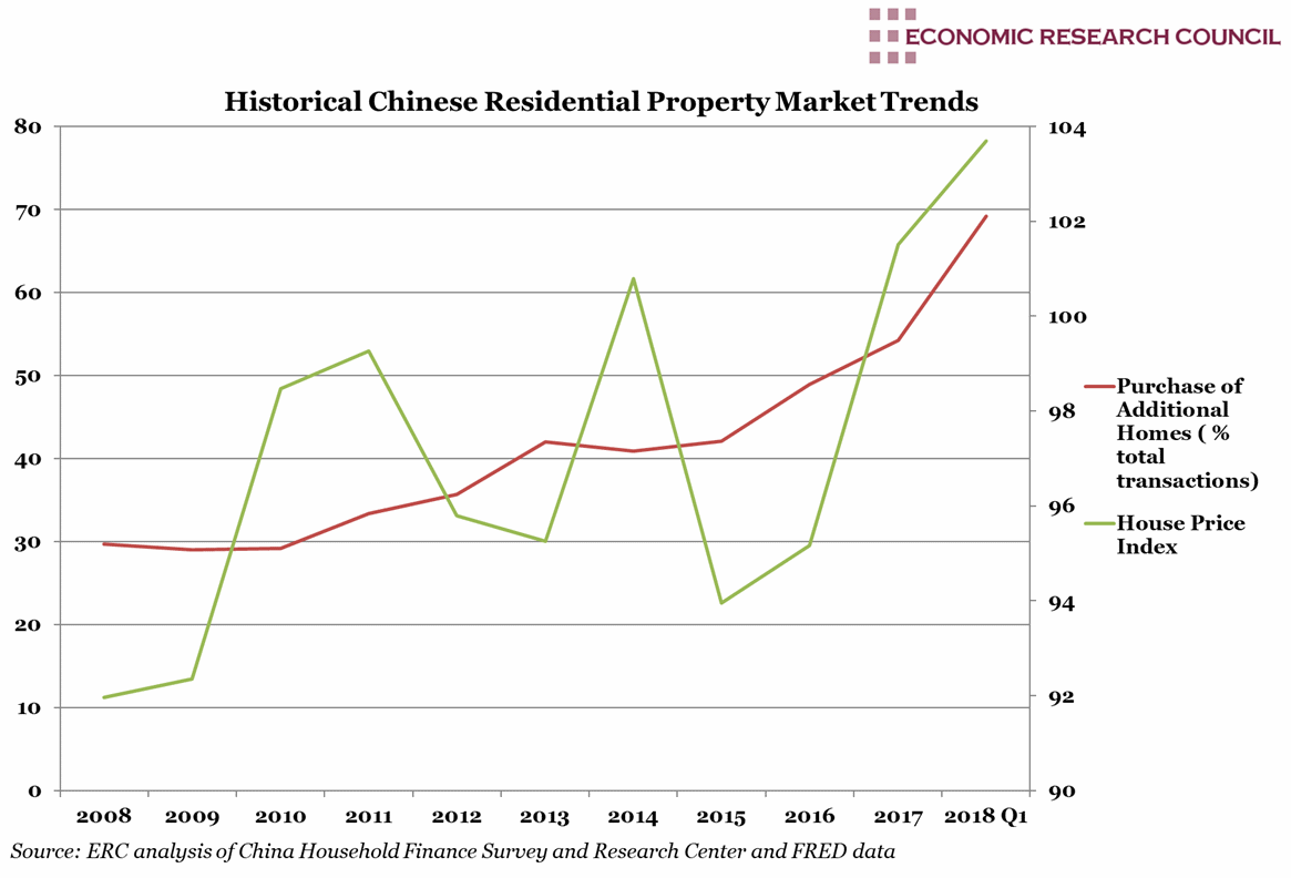 The red line on this chart shows the percentage of new houses purchased as additional homes, measured on the left-hand axis. ‘Additional’ refers to households or investors who already own one residential property and are buying their second, third, or more. The green line plots the Chinese House Price index, between 2008 and the start of 2018, measured on the right-hand axis. The increase in residential investment has been accompanied by a substantial housing price increase, reflected by the Chinese House Price Index, which rose to 103.7 in 2018.