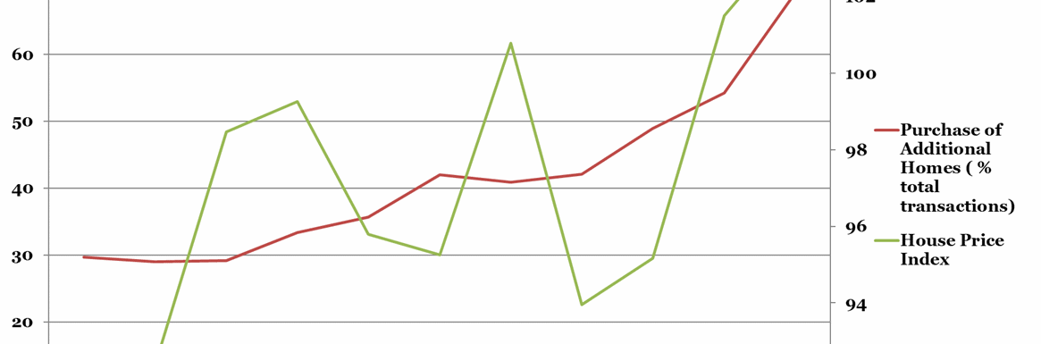 It would be unremarkable were house prices increasing as a function of total home purchases, however, this graph shows that the key driver of HPI rises is not the fundamental demand for housing. Rather it is in response to increased purchases of multiple residential properties, reflective of increased speculation. This is further evidenced by the reports of vacant urban housing, accounting for as much as 22% of all urban housing, according to recent estimates (over 50 million homes).