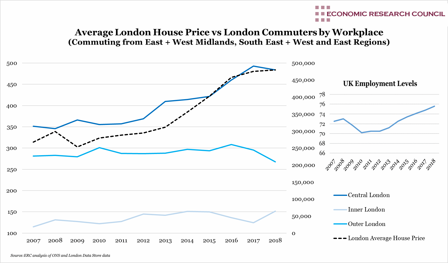 Since 2007, the number of people commuting from outside London into London for work has increased 20.9%. In the same period, London house prices have increased by 79.2% or by circa £212,000 per house on average. The biggest proportion of this growth has been in central London workers. From 2015-2017 there was a 16.8% increase in people working in central London who travel in from outside the city (see below for regional breakdown). Over that same period the average price of a house in London rose by 18.1%. Most recently, the number working in outer London has decreased- down 10.1% from 2017 to 2018. Simultaneously the number of outside London commuters working in inner London has increased by 21.6%. Some of the underlying factors driving these trends may include costs of transportation, work-life balance and government policy.