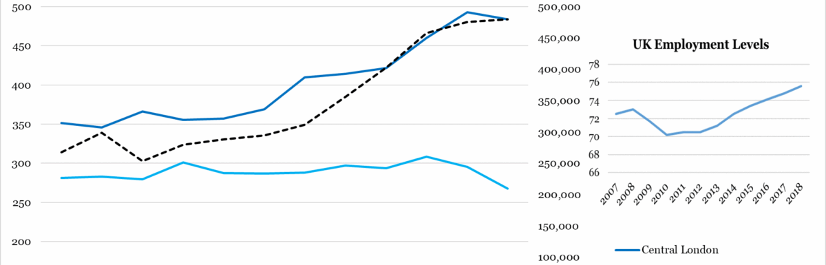 The in-set graph tracks UK employment levels and is measured as a percentage (taken from q1 of each year). All data is from the period 2007-2018 and is taken from the Office of National Statistics via London Data Store.