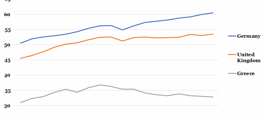 The series plotted on the chart represent gross domestic product per hour worked, measured in nominal US Dollars for Germany (Blue), the United Kingdom (Orange), and Greece (Grey). GDP per hour worked is a measure of productivity focusing on labour inputs. GDP is divided by total hours worked in an economy and the result is a measure of the marginal productivity of one hour of labour. Labour productivity can be affected by numerous variables. Prominent factors which augment labour are human capital (skills), technology and access to appropriate capital goods (machinery). Even though it is a helpful measure of productivity, it is because of these augmenting exogenous variables that GDP per hour worked only reveals a partial narrative in terms of productivity and its contributing factors.