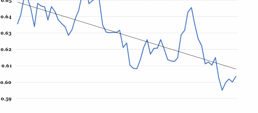The blue line plots the share of income received by labour as a proportion of US GDP from 1950-2014. ‘Share of income’ refers to the proportion of GDP in an economy paid out to the two main factors of production; labour and capital(stock, land etc.). Using this dichotomy, the capital share and labour share of income as proportions add up to one (representing total GDP). Therefore, should one decrease, the other increases. In order to demonstrate more clearly the overall trend, a black line of best fit has been added. Although helpful, this line does obscure smaller trends in the data.
