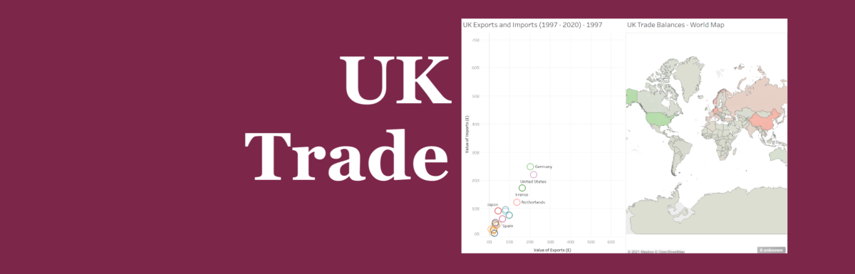 We invite you to explore the data shown above to understand the characteristics of UK trade. For the chart to the left, use the slider (or press play) to observe how patterns of trade have changed over time between the UK and key trading partners. Use the search function to add specific countries, although you may wish to remove others in order to properly see the trend over time. For the map, hover over each country to view the value of exports and imports, as well as the balance of trade. Countries highlighted in red are ones where the UK has a trade deficit, while green countries are ones in which the UK has a trade surplus.