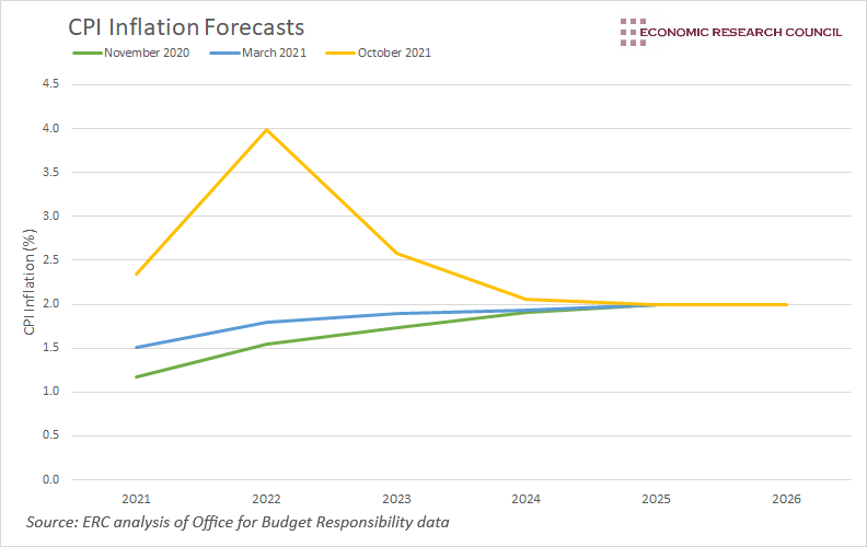 A strong rebound in demand combined with constraints to supply have altered the OBR’s forecasts for inflation over the coming years. It is expected to peak at 4% next year, before falling back to its target in the medium term. It is worth noting, however, that the OBR are also preparing for a scenario in which inflation peaks at 1% higher than the above forecast and falls back to the 2% target a year later than predicted.