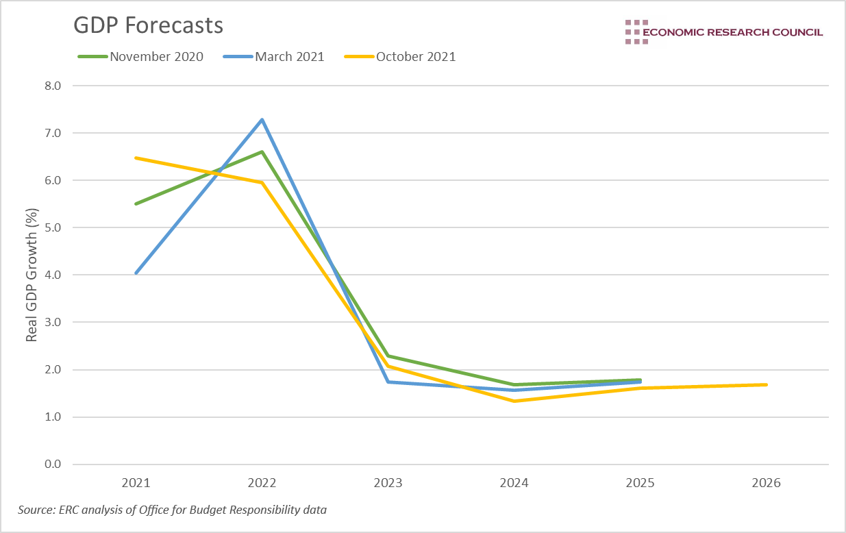 Each GDP forecast paints a similar picture, with a strong short term rebound in growth, before returning to a steady rate of around 1.5%. However, whilst March’s 2021 growth forecast was more pessimistic, the OBR now expects the UK economy to grow by almost 7% this year, as the March forecast overestimated the fall in output associated with the last lockdown. Despite this, the supply constraints that are currently being experienced are expected to slow the rate of growth relative to the OBR’s last forecast.