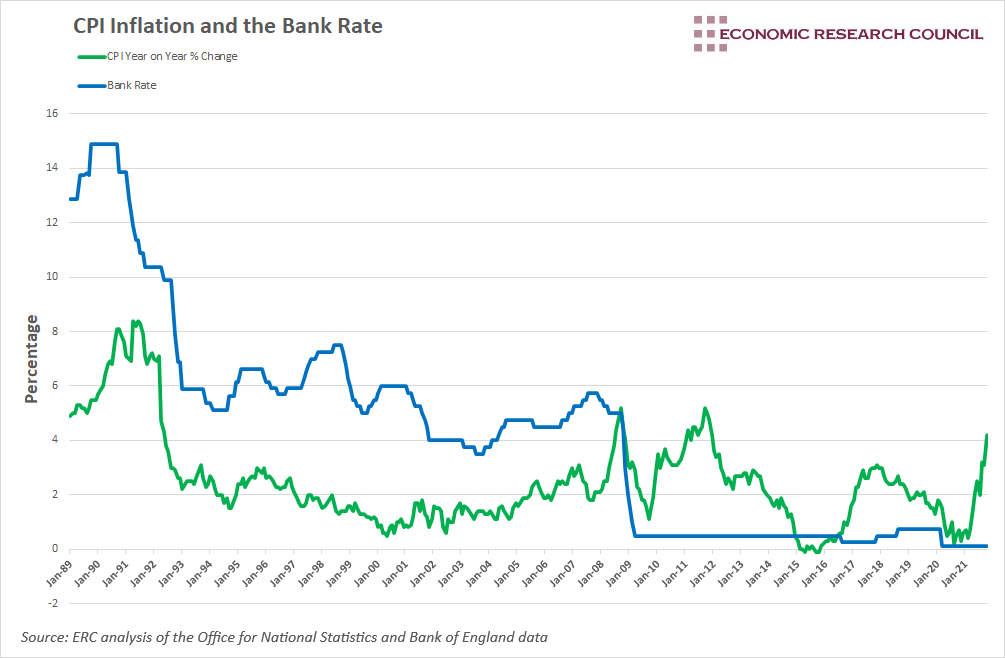 The chart displays the rate of CPI inflation as well as changes to the Bank Rate since 1989. Whilst the Bank Rate seems to follow conventional wisdom up until 2008, the positive correlation between it and the rate of inflation disappears after the financial crisis.