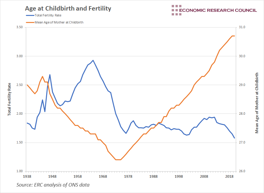 Fertility rates are at historic lows whilst the average age of childbirth has been on the rise since the 1970s. This week’s chart assesses the likely effect of this on individuals and society.